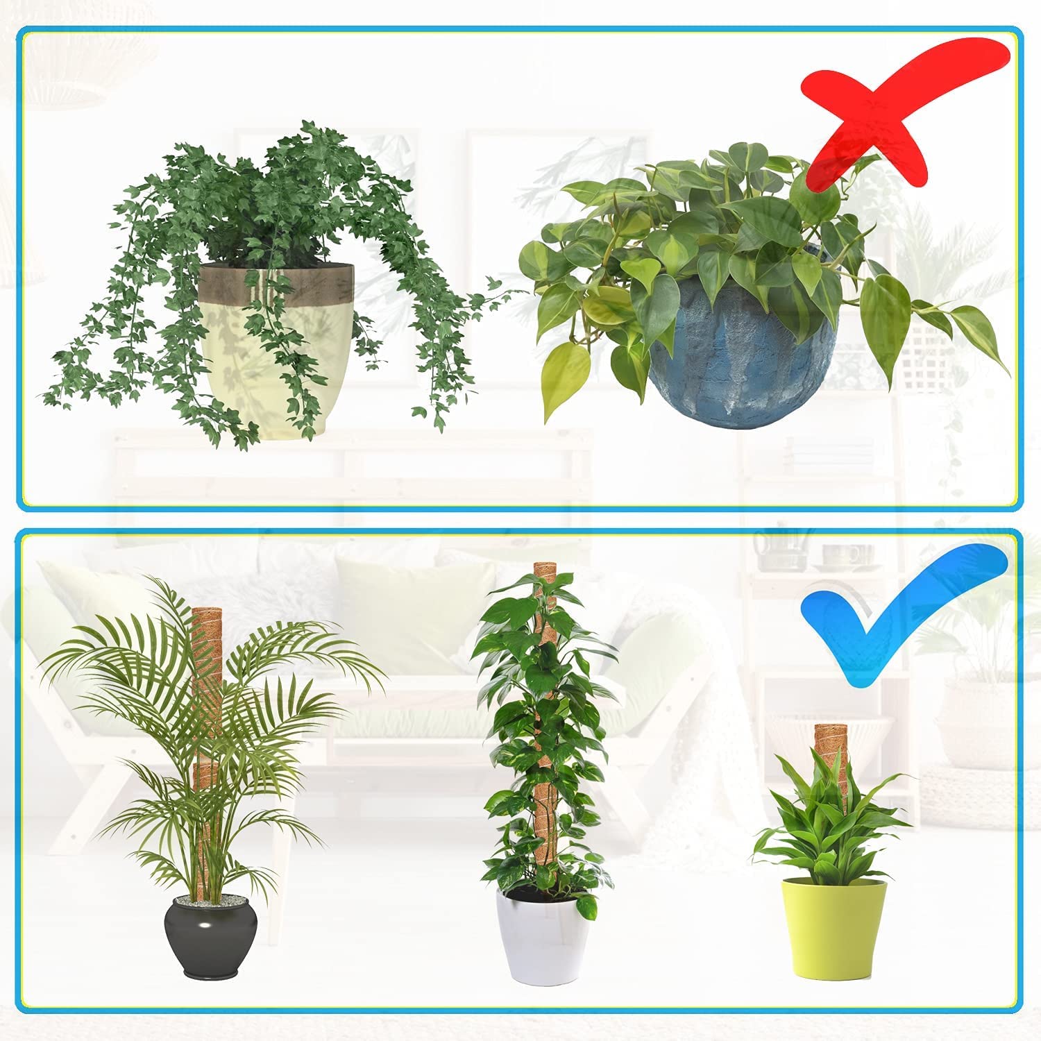 - Lo más necesario para las plantas trepadoras: ¿Estás cultivando pothos, Money Plant, Monstera u otras plantas trepadoras? Cuando las hojas y los tallos son muy pesados, se empujan hacia un lado, use nuestro poste de musgo de fibra de coco para ayudarlo a resolver el problema.