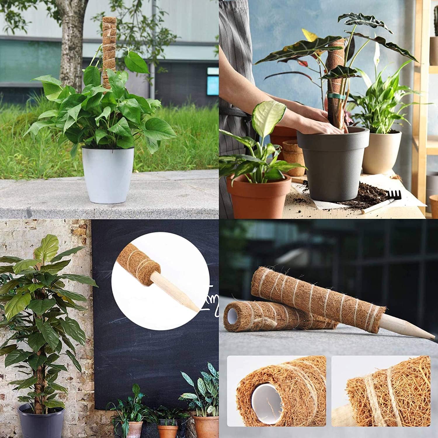 - Soporte de poste de tótem de coco resistente: la parte inferior del poste de musgo es puntiaguda y fácil de insertar en el suelo. Las plantas se pueden atar con dos cuerdas de fibra. Si cree que la longitud del poste de musgo no puede satisfacer sus necesidades, puede insertar la segunda punta en el primer tubo hueco para extender la longitud y brindar un soporte sólido para la expansión de la planta.