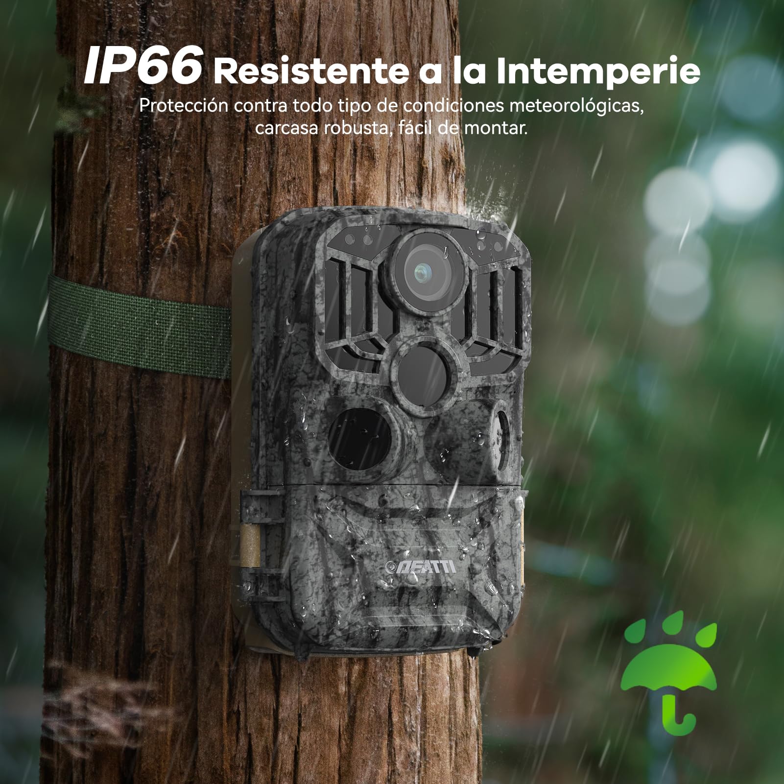 - IP66 Impermeable&Múltiples Funciones&Accesorio - La DEATTI-T4 camara trampeo tiene un grado de impermeabilidad IP65 para resistir todo tipo de condiciones meteorológicas y polvo sobre el terreno. Otras funciones: incluye numeración de fotos, intervalo de tiempo, retardo de tiempo, sensibilidad PIR y protección mediante contraseña. Accesorios: Tarjeta SD de 32 GB, 8 pilas, soporte de pared, cable USB y correa.