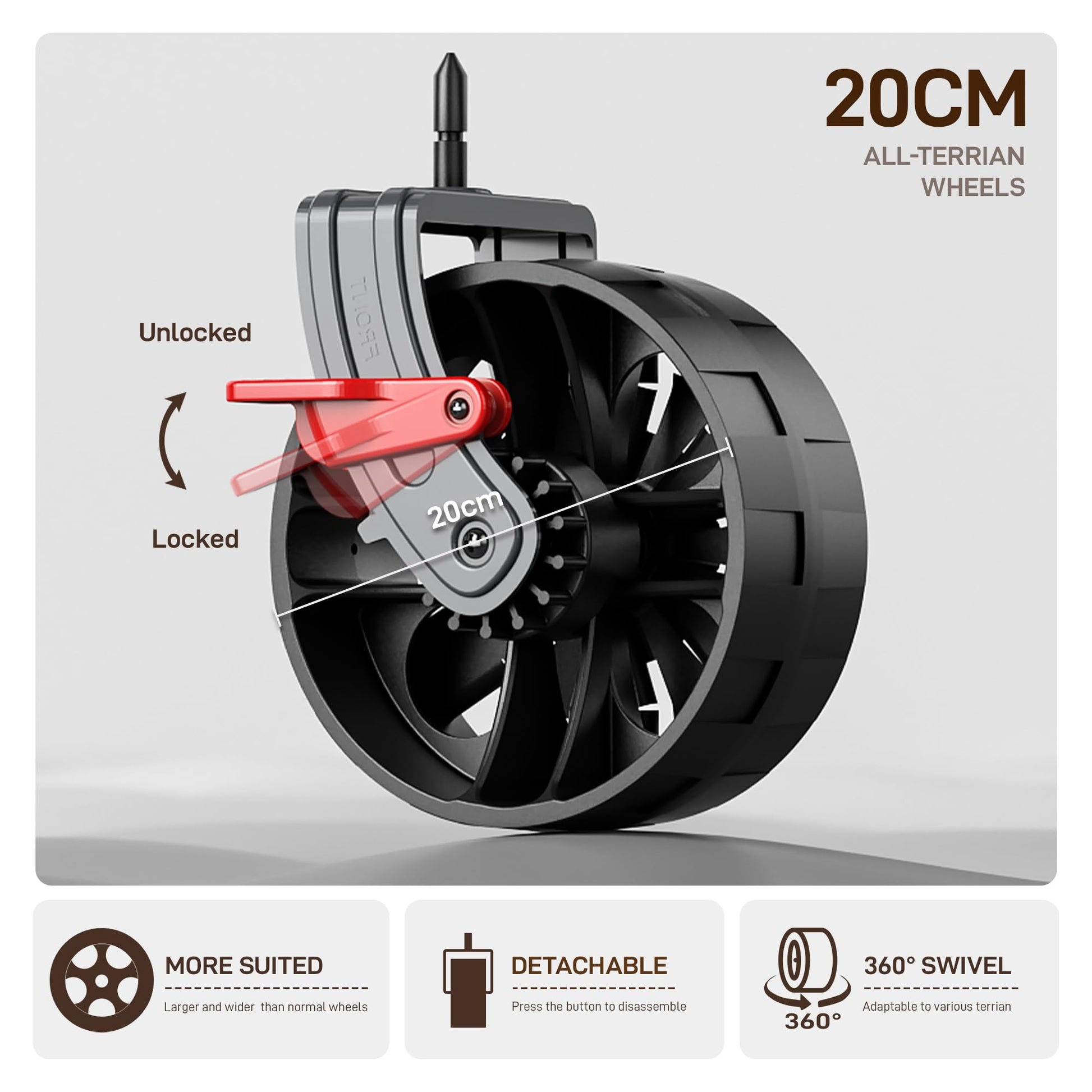 - Ruedas todoterreno: ruedas grandes todo terreno, más anchas que las ruedas normales. Las ruedas delanteras pueden girar 360 grados y ambas están equipadas con frenos. Las ruedas universales hacen que sea fácil girar en la dirección donde quieras ir. Las ruedas de liberación rápida te ayudan a almacenar el carrito de compras plegable rápidamente. Se utiliza un proceso especial para que sea más estable y produzca menos ruido