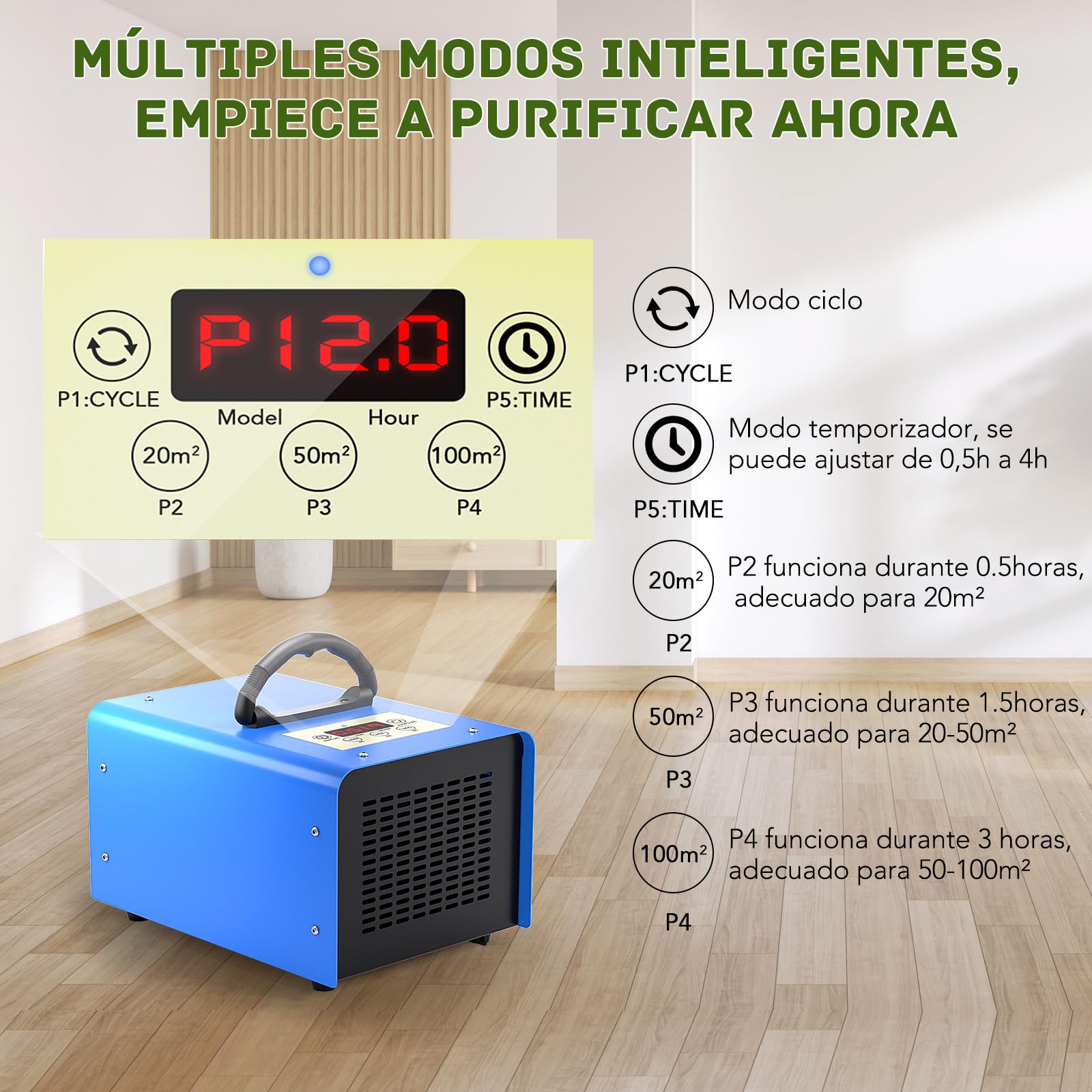 - MODO DE CICLO Y TEMPORIZADOR: El modo P1 es un modo de purificación cíclica automática con 2 h de funcionamiento, 22 h de espera y apagado automático tras 14 ciclos. El temporizador inteligente purifica el espacio fácilmente. El modo P5 es un modo de temporización, configurable entre 0,5 h y 4 h, que puede purificar un espacio de hasta 300 m². Gracias al generador de ozono inteligente, podrá lograr la purificación con precisión y reducir la inhalación de ozono