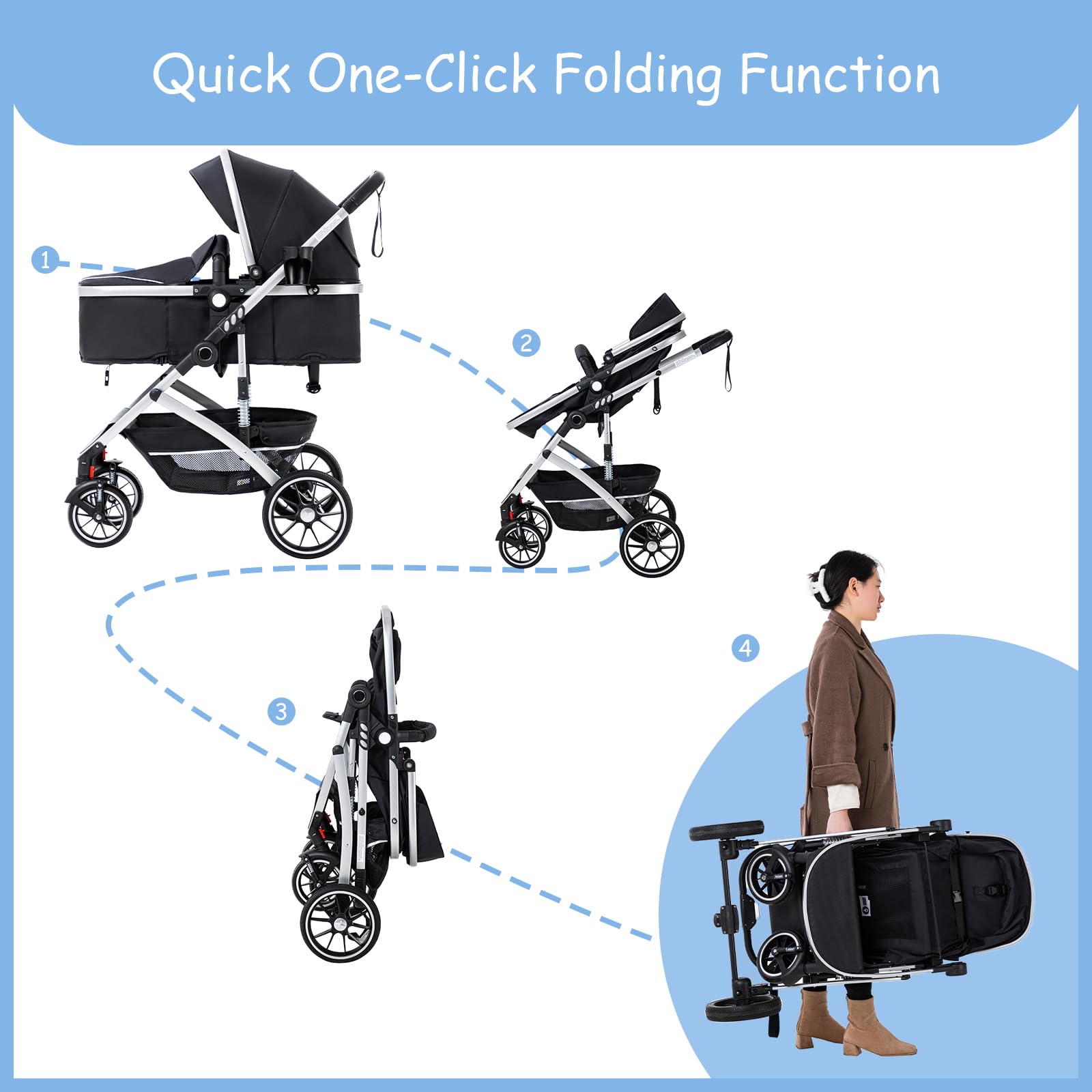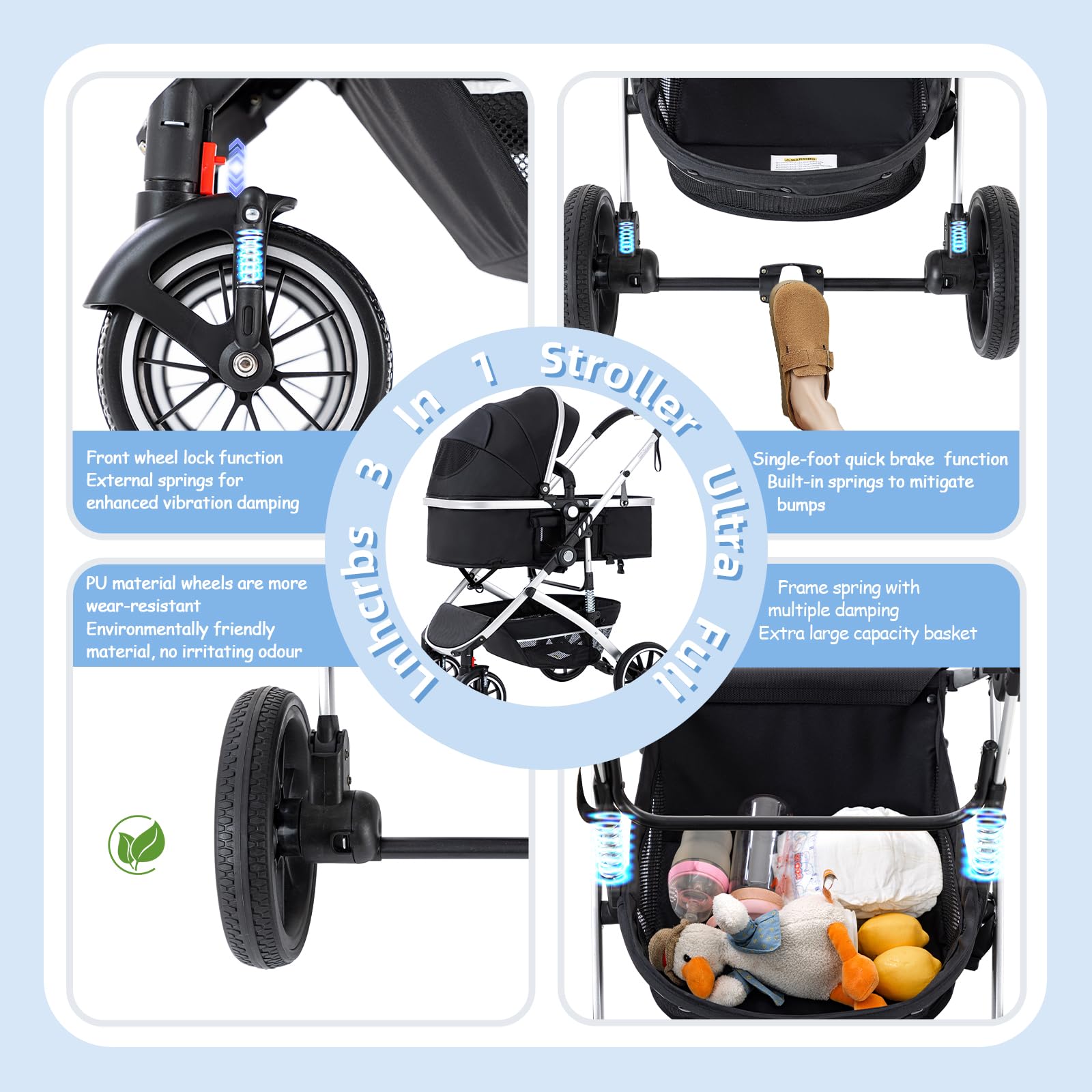 - Silla de paseo 3 en 1 multifuncional: La silla de paseo bebe puede ajustarse fácilmente para combinar una silla de coche, una cuna y una silla de paseo; la cuna combina una posición reclinada y una posición sentada, con una cesta para dormir que admite tres ajustes de ángulo (180° para dormir profundamente tumbado, 150° para reclinarse cómodamente con vistas y 135° para sentarse de forma interactiva y social), y con un diseño reversible en dos direcciones