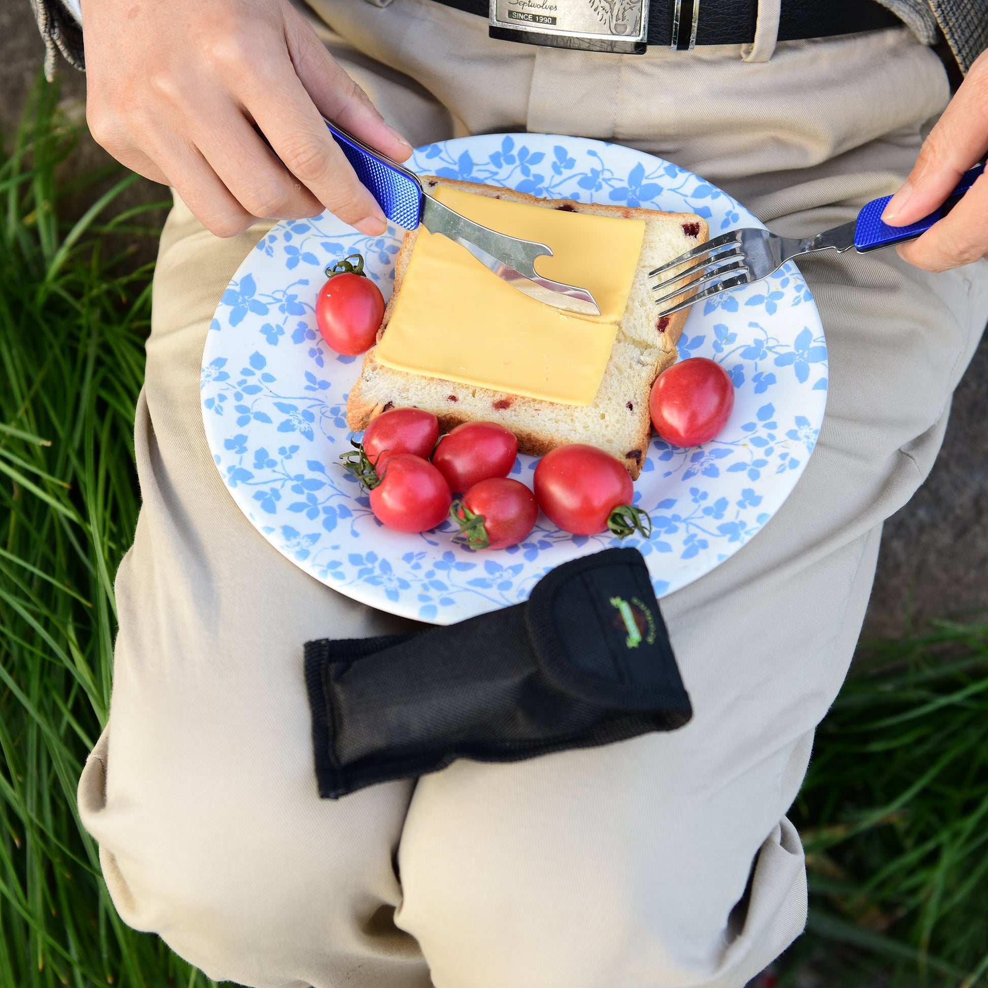 OUTDOOR FREAKZ Cubiertos para cámping plegable - Vajilla de exteriores de acero inoxidable con bolsa de neopreno (blue +)