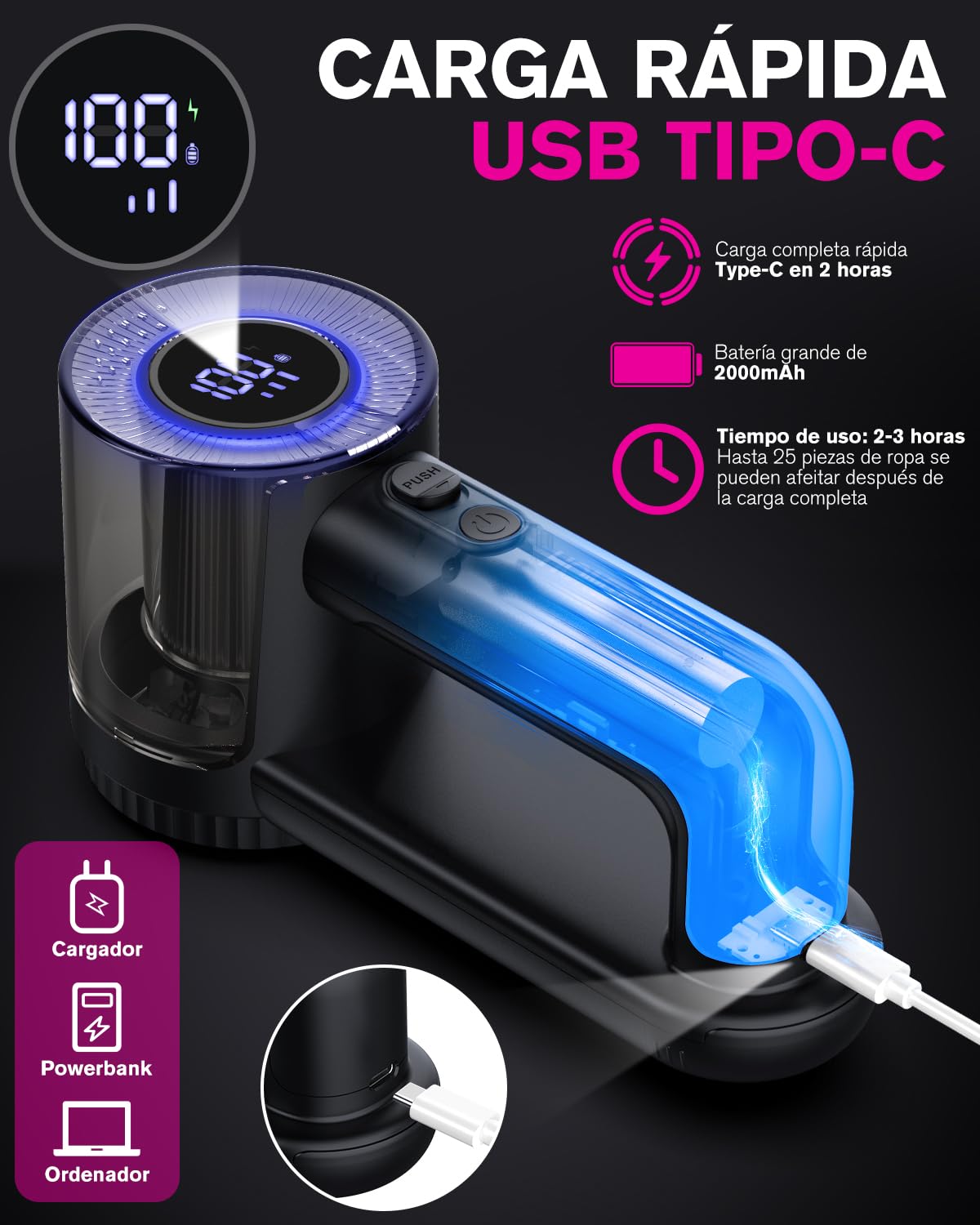 - 【Batería Recargable de 2000mAh】 Disfruta de hasta 3 horas de uso continuo con la batería de 2000mAh de este quita pelusas electrico recargable. Con su puerto USB-C, no tendrás que preocuparte por cambiar baterías, lo que lo convierte en el perfecto para viajar. El mango es ergonómico, cómodo de sujetar y fácil de manejar, lo que garantiza que no se sienta fatigado al utilizarla durante largos periodos de tiempo.